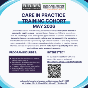 For more information, join Futures Without Violence and Workplaces Respond to Domestic & Sexual Violence for an informational session: