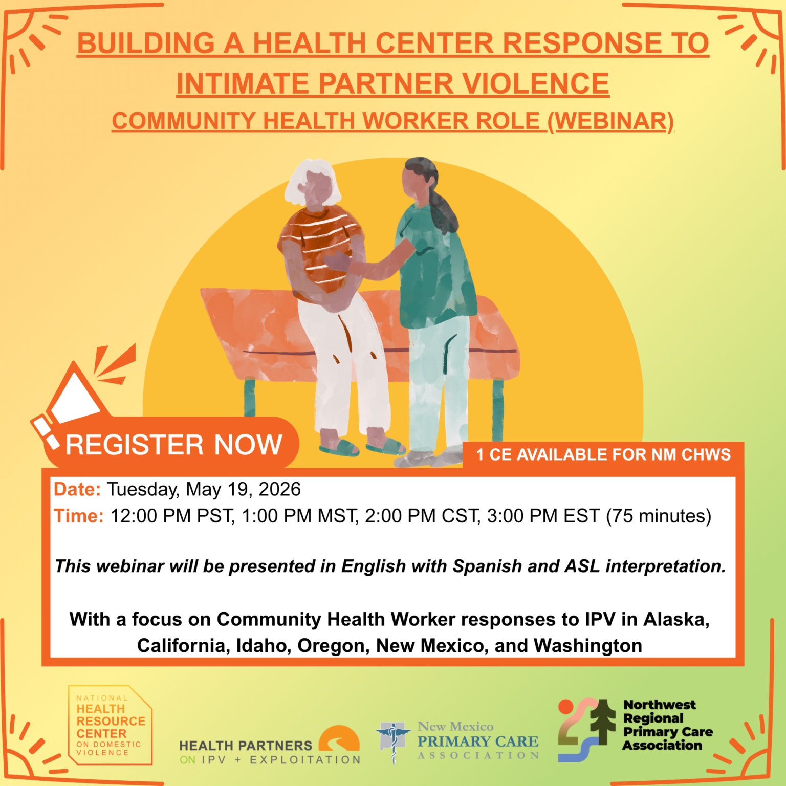 Community Health Workers are trusted bridges between the clinic and the community—often hearing what patients don’t share anywhere else. Join Futures Without Violence programs, the National Health Resource Center on Domestic Violence and Health Partners on IPV +Exploitation, to learn how community health workers can support their patients who experience intimate partner violence. The webinar will highlight health center responses for California, Idaho, New Mexico, Oregon and Washington (with participation from NMPCA and NWRPCA) and is open to a national audience. NMPCA is offering CEs to participating New Mexico staff.