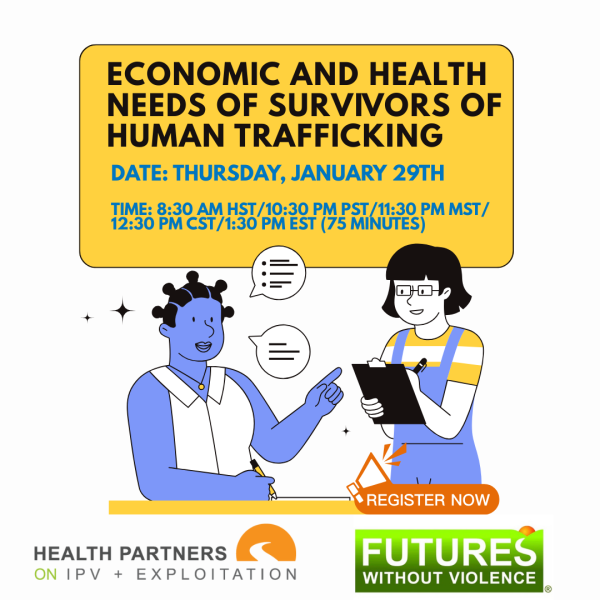 Description: In recognition of Human Trafficking Awareness Month in January, two projects from Futures Without Violence, Health Partners on IPV +Exploitation and the Center for Economic Futures, are hosting an online training focused on the health and well-being of human trafficking survivors. The webinar will explore how to address their economic and employment needs, including mental health and primary care needs, with a lens on health center strategies.
