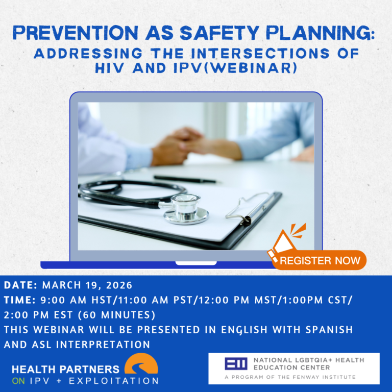 Health Partners on IPV + Exploitation hosts several national webinars on various topics relating to supporting those at risk of experiencing or surviving IPV, HT, and exploitation throughout the year. Many of these webinars are open to the public and participants are not required to be associated with a health center or health program. Webinars are one-time events (rather than a series of meetings) that will be recorded and shared on our Archived Webinar page afterwards, along with the slides and related materials from the presentation.